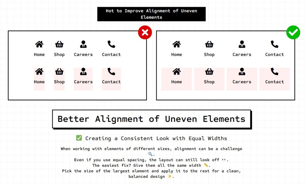 Hot to Improve Alignment of Uneven Elements Home Shop Careers Contact Home Shop Careers Contact Home Shop Careers Contact Home Shop Careers Contact ✅ Creating a Consistent Look with Equal Widths When working with elements of different sizes, alignment can be a challenge 🔍.Even if you use equal spacing, the layout can still look off 👀.The easiest fix? Give them all the same width 📏.Pick the size of the largest element and apply it to the rest for a clean, balanced design ✨. 🔥 Pro ELEMENTOR Tip: Perfectly Align Columns in Elementor with Flex Settings Want a sleek horizontal layout with equal-width items? Try this Elementor hack: 1️⃣ Set your Container Direction to Row (Horizontal) ➡️2️⃣ Switch Wrap to No Wrap 🚫3️⃣ Adjust the Columns Gap for perfect spacing 📏4️⃣ Set each element’s Width to 25% if there are 4 elements(100/number of elements) for four equal columns 🔥 ✅ Result: A clean, responsive design that looks amazing without extra widgets or complicated settings. ✨ Bonus Tip: Need 3 columns? Set width to 33.33%. Need 5? Go for 20%! 🎯 Home Shop Careers Contact Home Shop Careers Contact